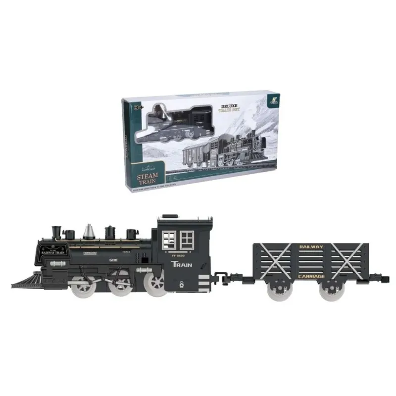 Súčasťou: mašinka, 1 vagón, 6 zahnutých koľajníc, nádobka na vodu.