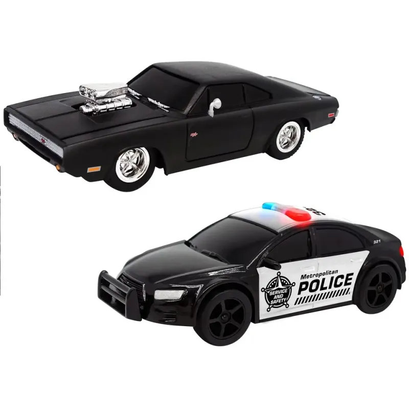 Na pretekárskej dráhe si môžete otestovať svoje vodičské schopnosti pomocou autíčka Dodge Charger v mierke 1:43 alebo policajného auta s blikajúcimi svetlami.