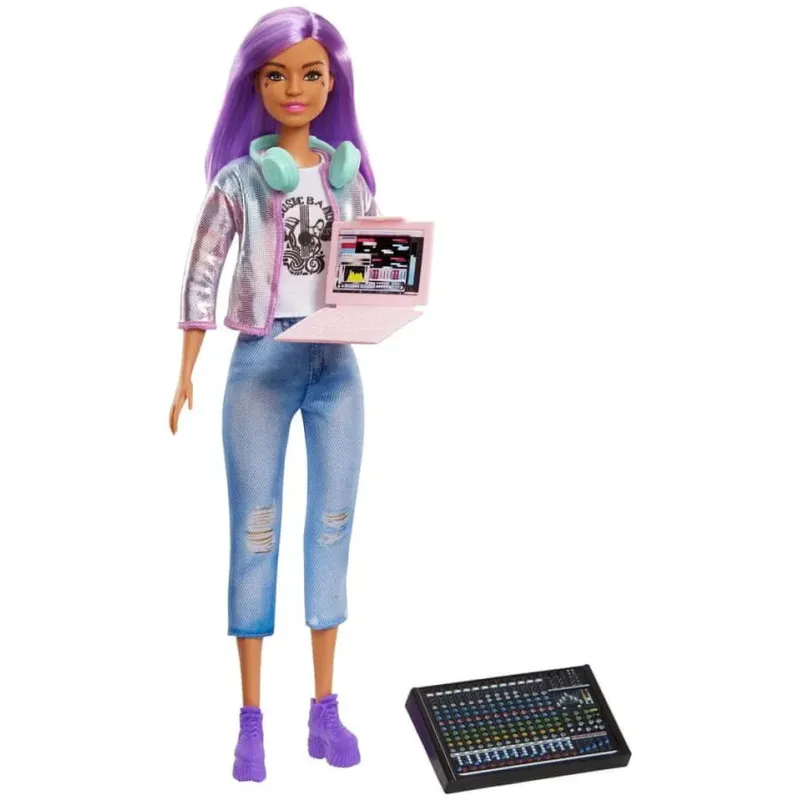 Bábika má úžasné fantasy vlasy a na sebe nosí grafické tričko, trendy džínsy a číru dúhovú bundu!V balení nájdeš tiež digitálnu zvukovú pracovnú stanicu, počítač a slúchadlá.Hudobní producenti sú zodpovední za celkovú víziu a ciele hudobného albumu a kreatívne riadia proces vytvárania nahrávky.A iba 2 % populárnej hudby dnes produkujú ženy, takže bábika Barbie Povolanie oslavuje túto vzrušujúcu kariéru.Skvelý darček pre deti od 3 rokov.