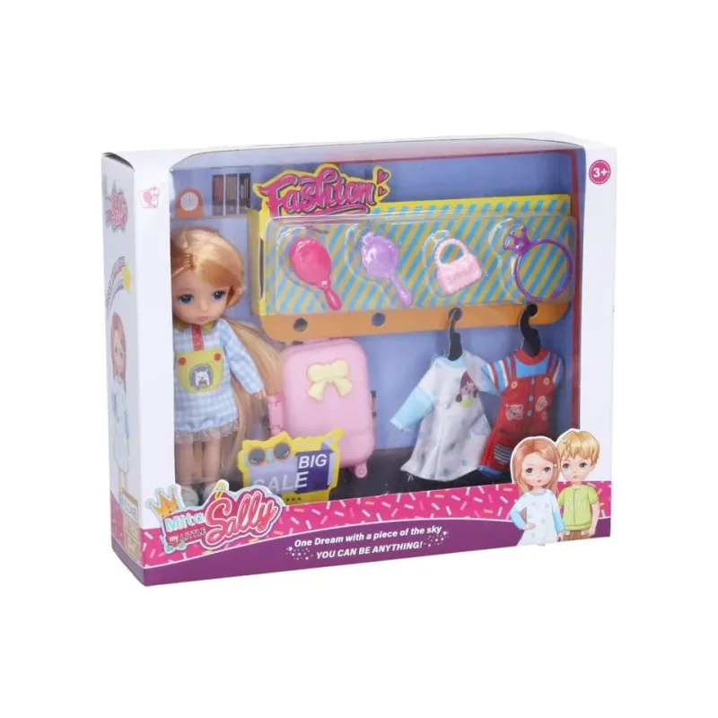 Bábika cestovateľka s dlhými blond vlasmi.Sada obsahuje: bábiku, cestovný kufor, 2x šaty, 2x hrebeň, kabelka, korunka.