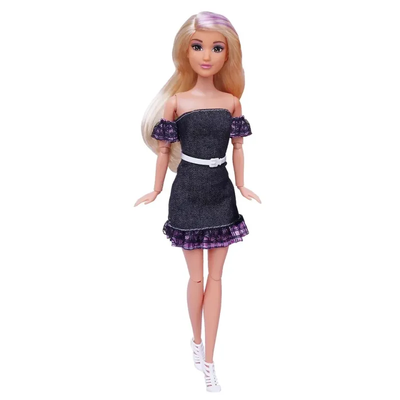 Krásna bábika s dlhými vlasmi v čierných džínsových šatách.