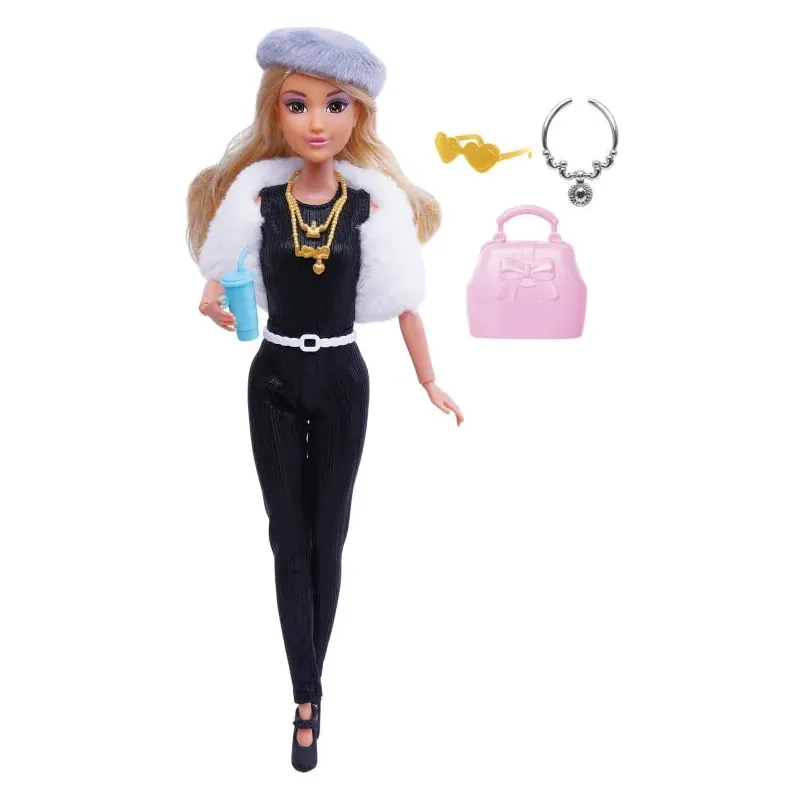Balenie obsahuje: bábiku, kabelku, náhrdelník, pohárik so slamkou a slnečné okuliare.