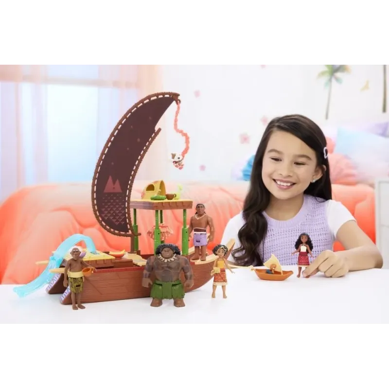 Táto plávajúca loď má dĺžku viac ako 40 centimetrov a obsahuje 10 doplnkov: 2 misky, 1 šálku, obal z cukrovej trstiny, jedlo, stôl, hojdacia sieť a malý čln pre Heihei.Deti od 3 rokov môžu zbierať všetky hračky Disney Vaiana 2 a predstavovať si nové dobrodružstvá v Motunui aj inde.