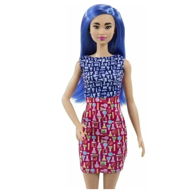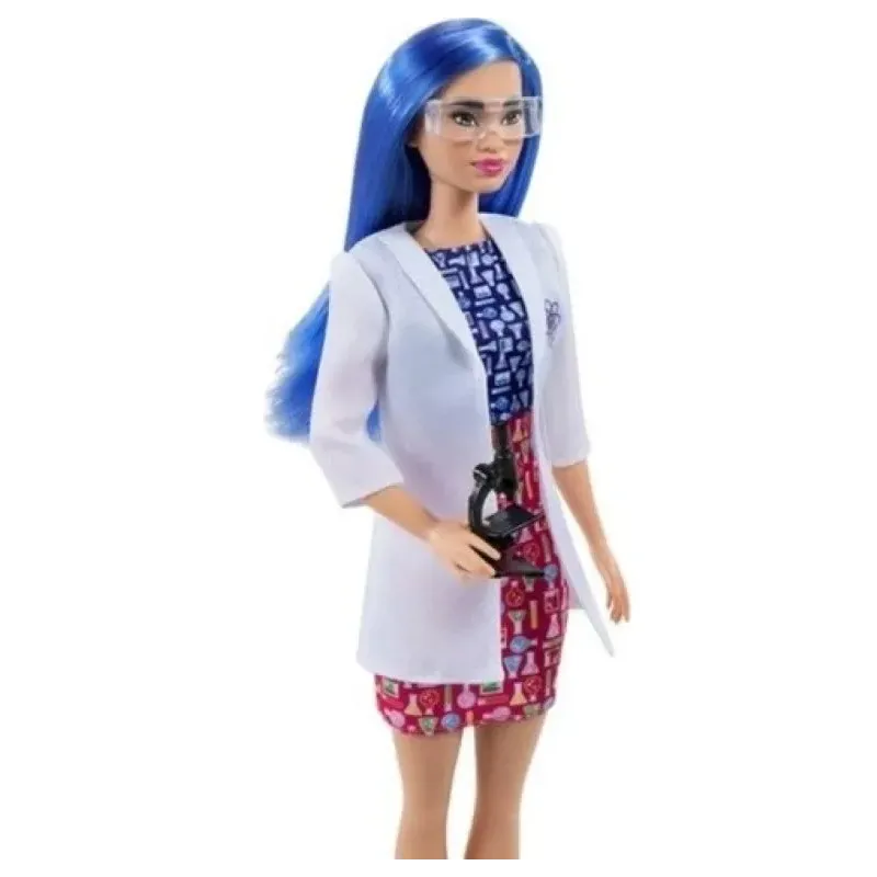 Bábika Barbie Vedkyňa má modré vlasy a nosí šaty s farebnou potlačou, biely laboratórny plášť s emblémom, okuliare a modré topánky.