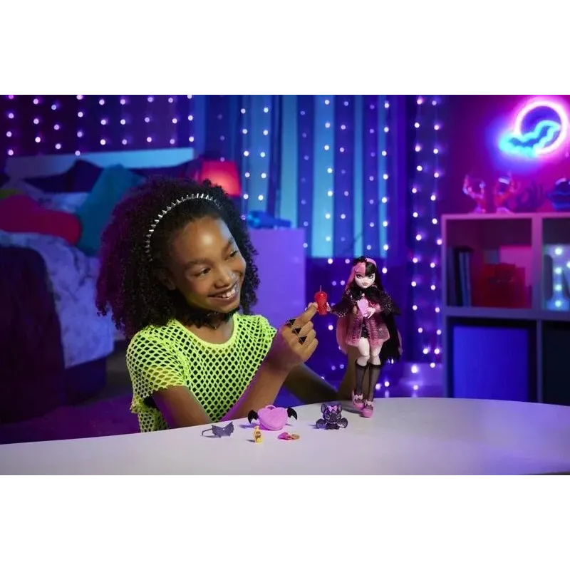 Draculaura sa prechádza po chodbách Monster High ako po prehliadkovom móle vo famóznych kraťasoch s cool srdiečkovou potlačou a korzetovej blúzke s priesvitnými rukávmi, ktorá je presne podľa poslednej upírskej módy.