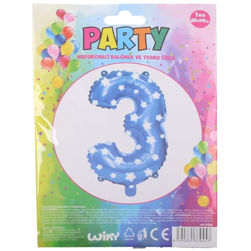 Vhodný na dekoratívne účely, ako párty doplnok alebo drobný darčekový a reklamný predmet. veľkosť balóna: 85 x 49 cmobsah balenia 1 ksmodrý s hviezdami, číslo 3