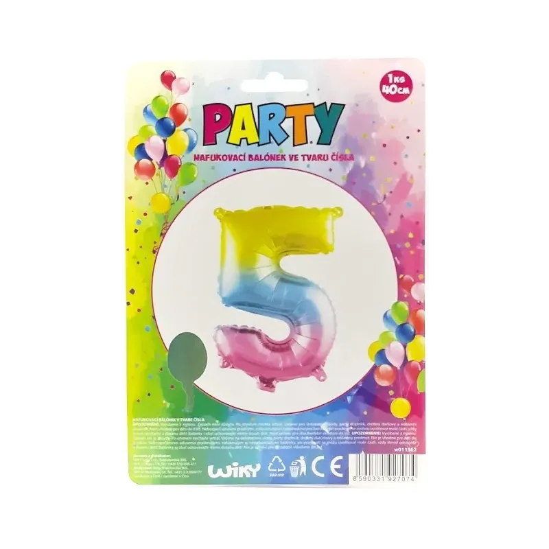 Nafukovací balónik v tvare čísla 5.Nafukovací balónik vhodný na dekoratívne účely, ako párty doplnok alebo drobný darčekový a reklamný predmet. veľkosť balóna: 40 cmdúhová
