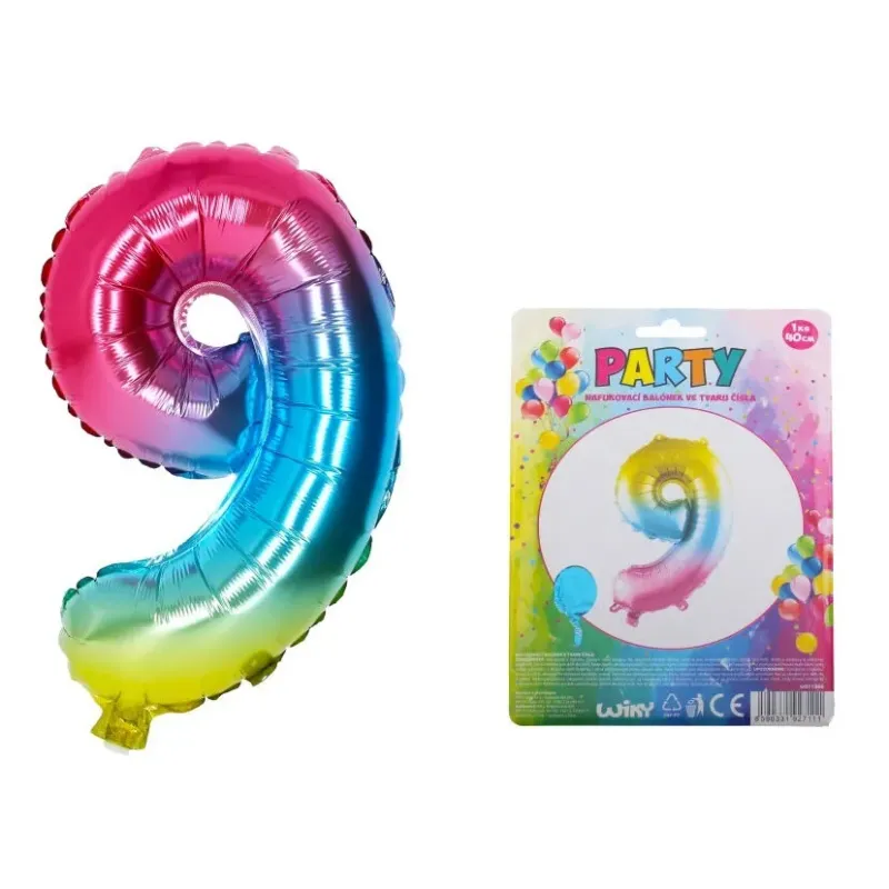Nafukovací balónik v tvare čísla 9.Nafukovací balónik vhodný na dekoratívne účely, ako párty doplnok alebo drobný darčekový a reklamný predmet. veľkosť balóna: 40 cmdúhová