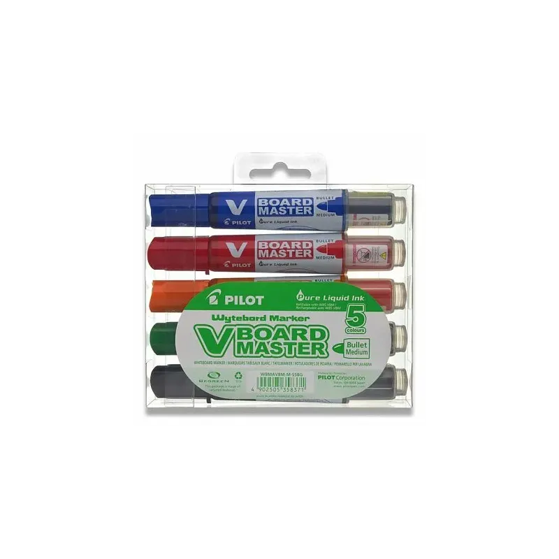 Sada 5 ks popisovačov. Kužeľový hrot. Tekutý atrament na bázealkoholu. Ľahko zotierateľná. Tlakuodolný hrot. Intenzívne farbyviditeľné aj z veľkej vzdialenosti. Stopa je pri použití neprerušovaná,žiadne nežiadúce škvrny. Viditeľný stav náplne, jednoduchá výmenanáplne.