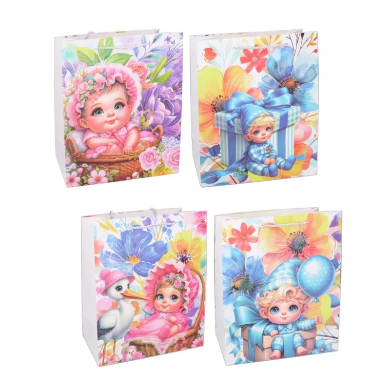 Darčeková taška vyrobená z kvalitného tvrdého papiera s rôznymi motívmi, vhodná na jednoduché balenie suvenírov a darčekov.