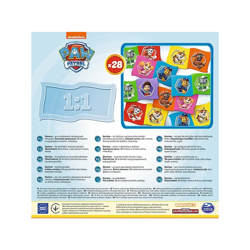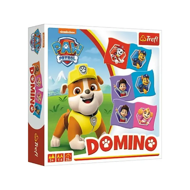 Trefl Domino Paw Patrol Domino s obľúbenými obrázkami Paw Patrol a jeho priateľmi.Domino je populárna hra s jednoduchými pravidlami vhodná pre všetky vekové kategórie.Balenie obsahuje 28 kartičiek.