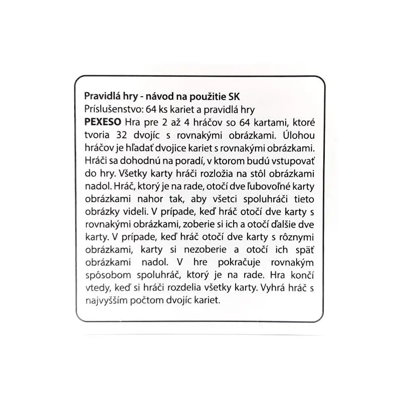 Deti si pri hre precvičujú pamäť, postreh, farby, učia sa trpezlivosti a hre v kolektíve.Pexeso obsahuje 32 dvojíc s rovnakými obrázkami, hra je určená pre 2-4 hráčov.