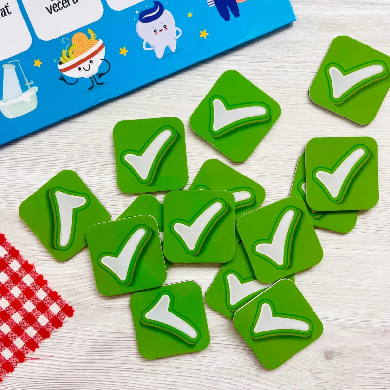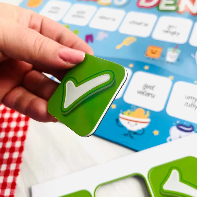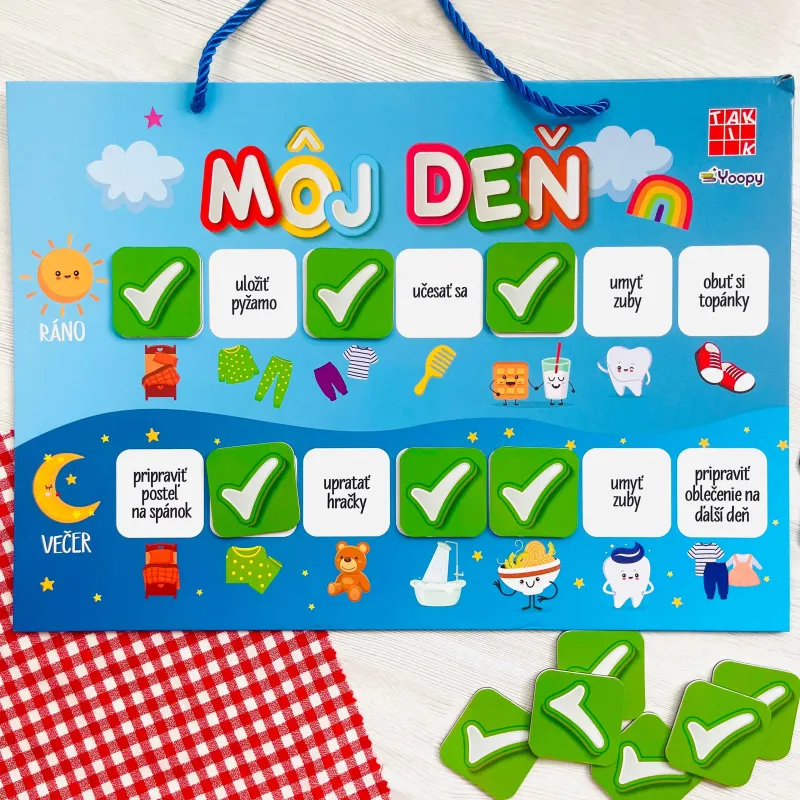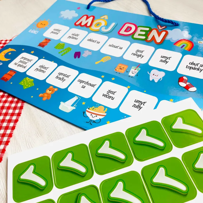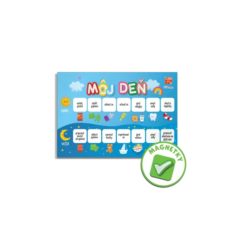 Magnetický denný organizér Môj deň prispeje k lepšej organizáciidetských aktivít pri rannom vstávaní a príprave do škôlky či školy, akoaj pri večernej príprave na spánok.