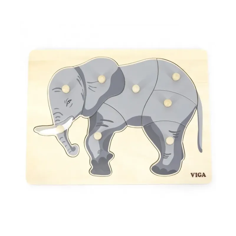 Tento multisenzorický prístup podporuje dôkladnejšie učenie, ktoré je veľmi dôležité pre kognitívny rozvoj. puzzle sa skladajú z 8 prvkov s úchytkami,úlohou dieťaťa je poskladať slona z dostupných prvkov tak, aby zodpovedal nielen obrázku, ale aj tvaru príslušných prvkov,úchytky uľahčujú malým ručičkám chytanie a držanie dielikov skladačky,zozbierajte celú sériu zvieracích puzzle.Rozmer drevenej dosky cca 30 x 22,5 cm
