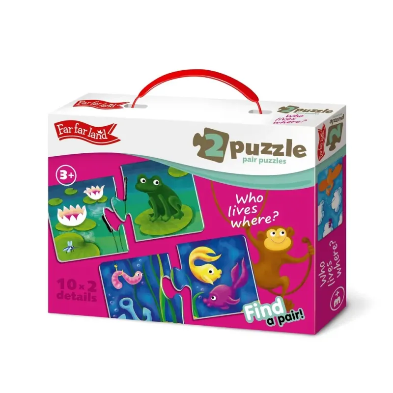 Každý obrázok sa skladá z 2 dielikov (na jednom dieliku je zvieratko, a na druhom ich príbytok)..Puzzle sú špeciálne navrhnuté pre malé deti od 3 do 5 rokov.
