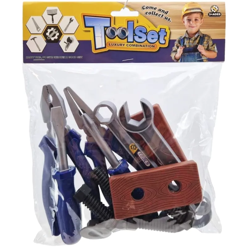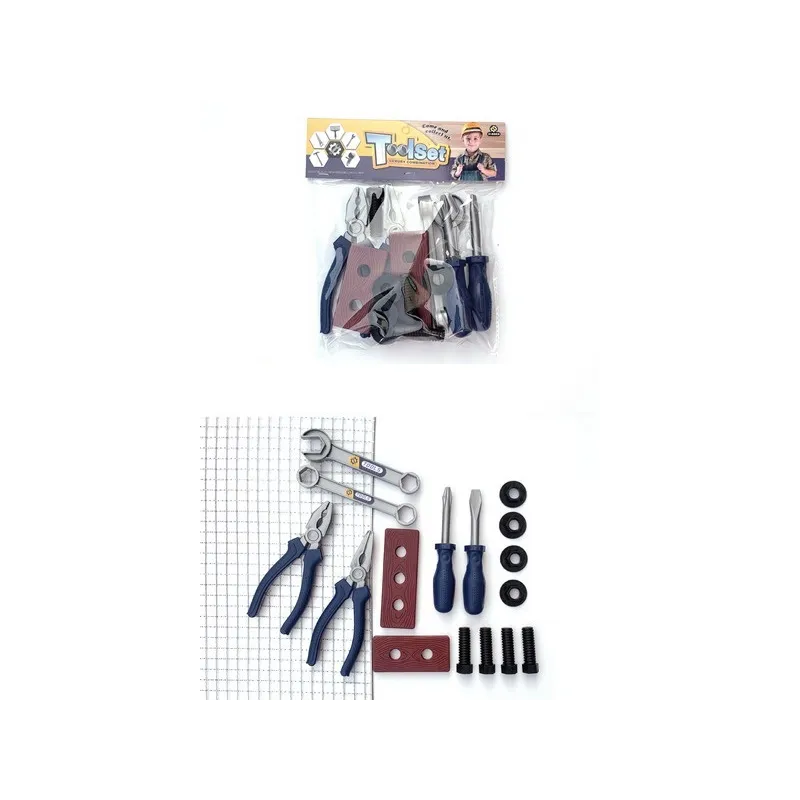 Sada obsahuje: kliešte, kombinačky, skrutkovač, francúzky kľúč, sadu šróbov, malé doštičky na skrutky.