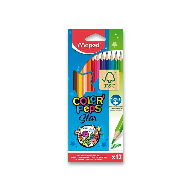 Súprava 12 kusov farebných ceruziek s veselým dizajnom. Ergonomickéfarebné ceruzky Maped Color'Peps majú trojhranné telo,mäkkú odolnú tuhu a jasné farby.