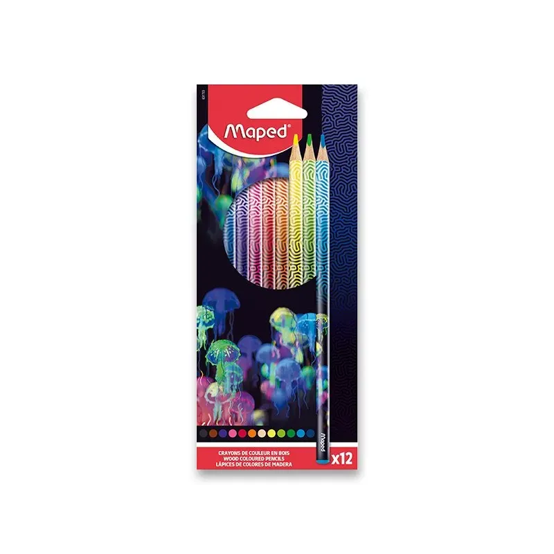 Súpravy 12 ks kvalitných drevených lakovaných farebných ceruziek MapedDeepsea Paradise v atraktívnom dizajne s motívom podmorského sveta.Farebná koncovka vo farbe farebnej ceruzky. Trojhranné telo, mäkká a odolnátuha, jasné farby.