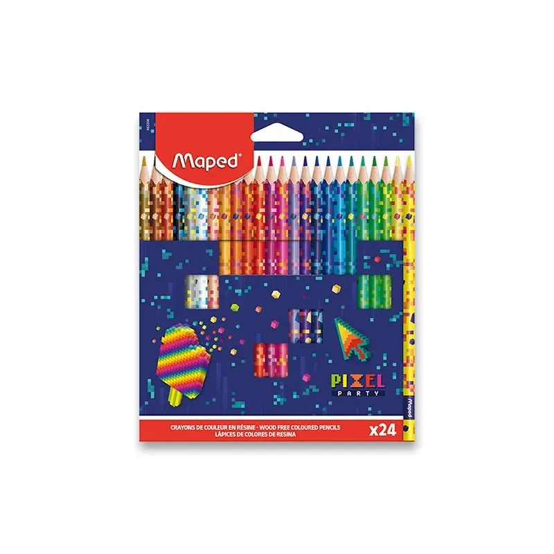 Súprava 24 kusov bezdrevných farebných ceruziek Maped Pixel Partys atraktívnym dizajnom inšpirovaným hernými kódmi. Ergonomické farebnéceruzky majú trojhranné telo, mäkkú odolnú tuhu a jasné farby.