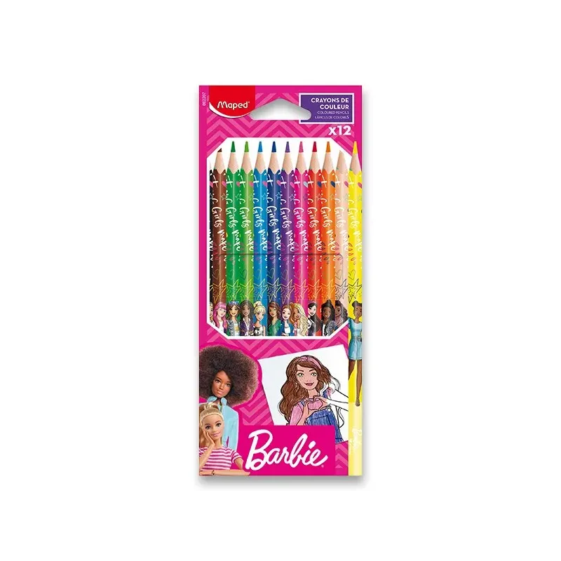 Súprava 12 ks kvalitných bezdrevných farebných ceruziek Maped Barbie.Atraktívny dizajn s motívom obľúbenej bábiky Barbie. Na každej farebnejceruzke je iná postava bábiky. Trojhranné telo, mäkká a odolná tuha,jasné farby.