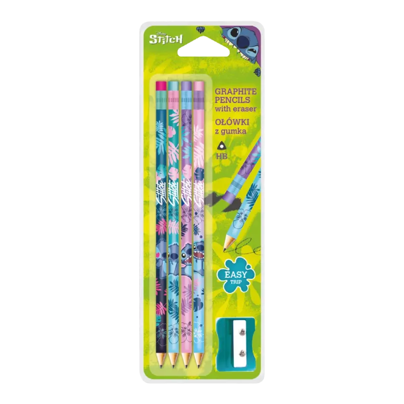 Grafitová ceruzka s veselým motívom tela roztomilého Stitcha. Mäkkáfarebná guma umožňuje odstránenie kresby bez poškodenia papiera. Tuhalepená po celej dĺžke je odolnejšia proti polámaniu. Trojhranný tvarposkytuje pohodlný úchop počas písania alebo kreslenia.