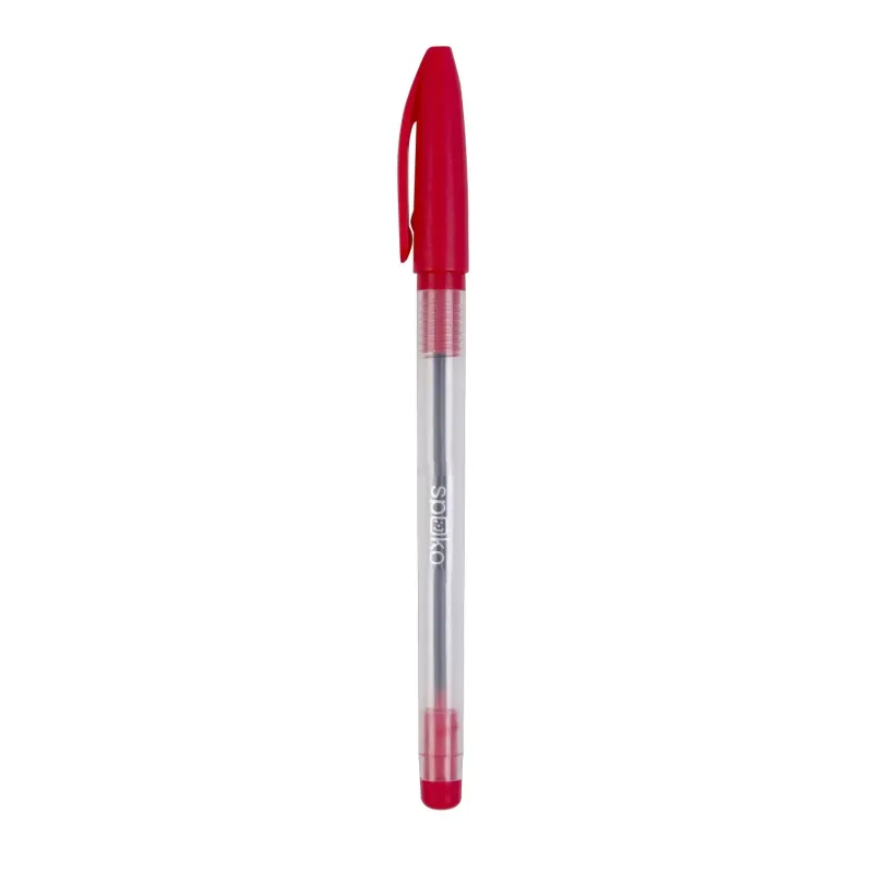 Jednorazové guľôčkové pero s priehľadným telom, ktoré umožňujekontrolovať množstvo náplne. Farba viečka zodpovedá farbe náplne.Tvarovaný úchop na pohodlné držanie. Tlačené logona tele.