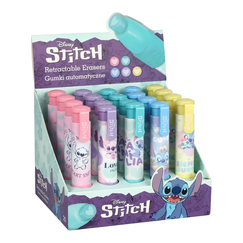 Praktická vysúvacia guma v dizajne, ktorý pripomína pero, s roztomilýmmotívom usmievavého Stitcha.