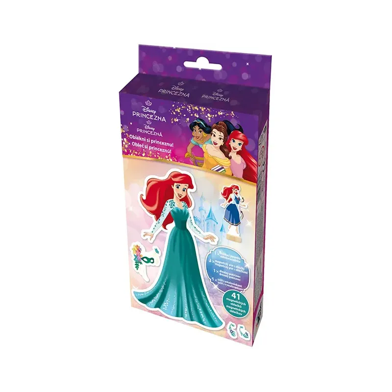 Balenie obsahuje magnetickú bábiku s dreveným stojančekom, 3 hárky magnetických šiat, topánok a doplnkov a maľovanku s 8 obrázkami.