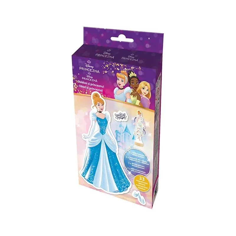 Balenie obsahuje magnetickú bábiku s dreveným stojančekom, 3 hárky magnetických šiat, topánok a doplnkov a maľovanku s 8 obrázkami.