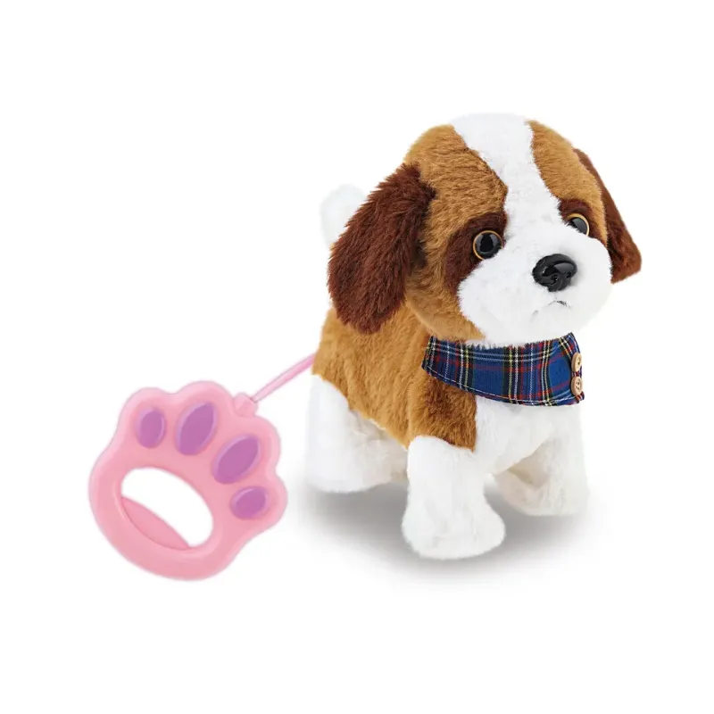 Plyšový hnedý psík je ovládaný pomocou kábla s ovládačom.
