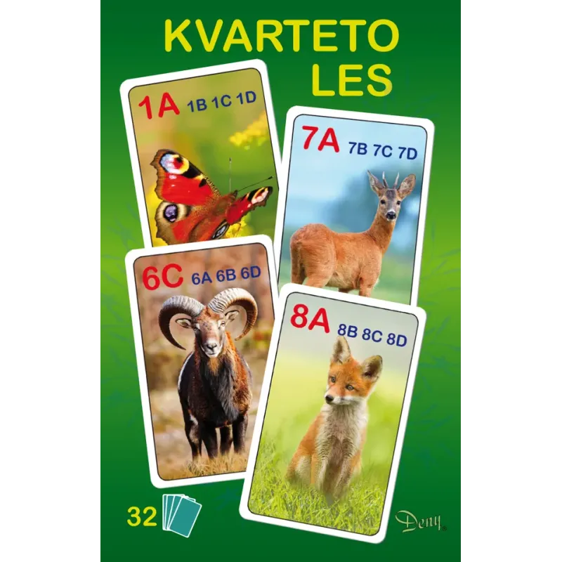 Set 32 ks hracích kariet s peknými fotografiami zvieratiek, s ktorými si môžete zahrať obľúbenú kartovú hru Kvarteto.