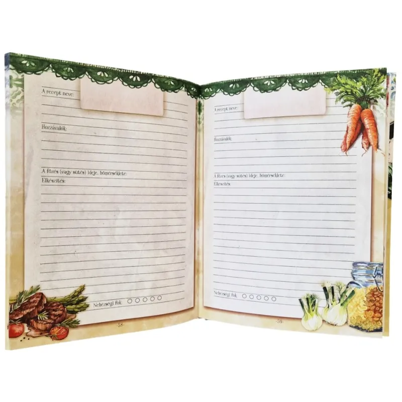 Kedvenc receptjeim ( Maďarská verzia )Különösen szép kivitelezésű könyvecskénk segítségével megalkothatja egyedi szakácskönyvét, amelybe öröm lesz feljegyezni a féltve őrzött családi recepteket és az utánozhatatlan specialitásokat.A fejezetcímek segítségével könnyen eligazodhat a levesek, főételek, desszertek, saláták és köretek útvesztőjében.
