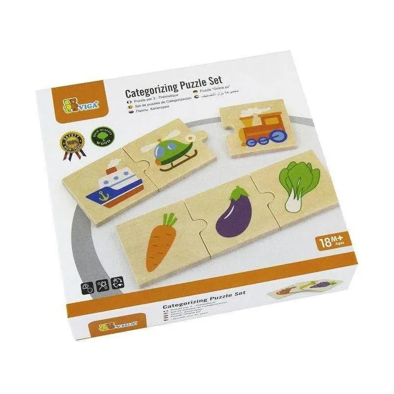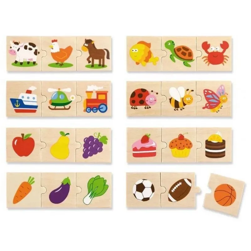 Balenie obsahuje 24 drevených puzzlí s motívmi ovocia, zeleniny, zvieratiek, jedla, hmyzu, športu a dopravných prostriedkov.