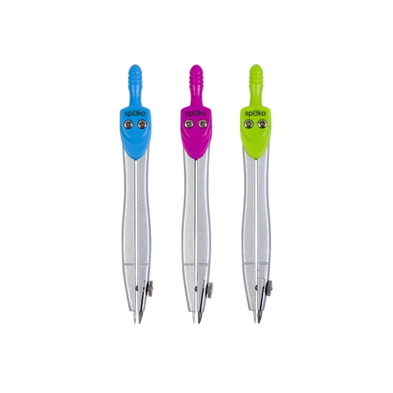Jednoduché kovové kružidlo v atraktívnych farbách. Ideálne pre prvýstupeň základnej školy. Manipulácia s tuhou pomocou povoľovacej skrutky.Tvarovaný úchop s drážkami na pohodlné držanie. Balené v transparentnomplastovom etui, vhodné do školského peračníka.