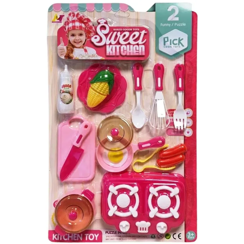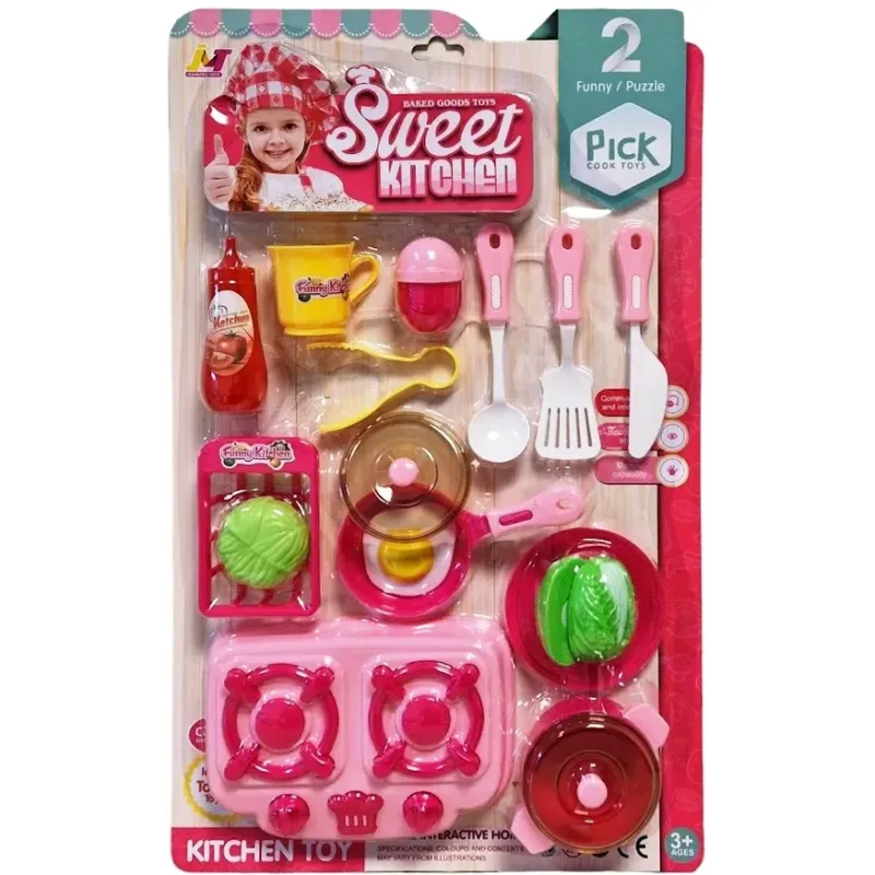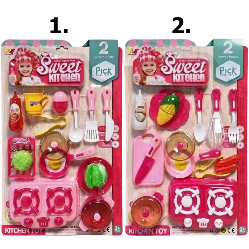 Sada č.1.s dvojplatničkou obsahuje: dvojplatničku, panvicu v pokrievkou, hrniec, tanier, vajíčko, zeleninu atď...Sada č.2.s doskou na krájanie obsahuje: dvojplatničku, dosku, nôž, panvicu s pokrievkou, hrniec s pokrievkou, tanier, kukuricu atď...Vhodné od 3+