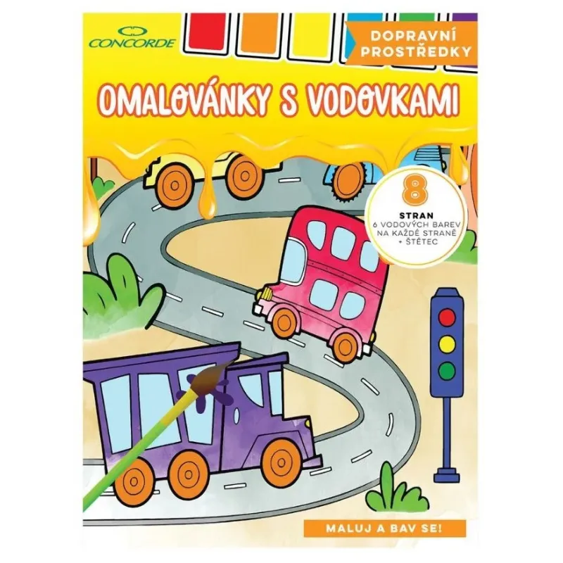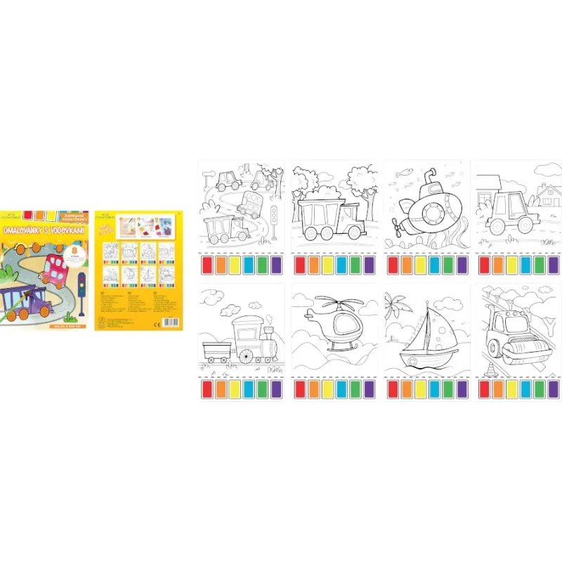 Maľovánky s vodovkami obsahujú 8 veselých obrázkov s motívomdopravných prostriedkov.