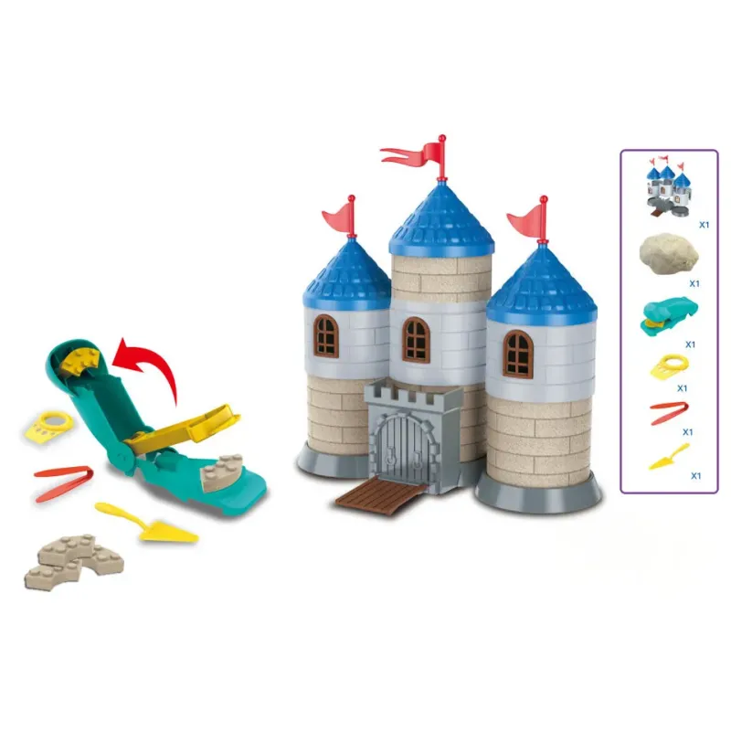 Sada kinetického piesku a príslušenstva potrebného na stavbu hradu z tehličiek.