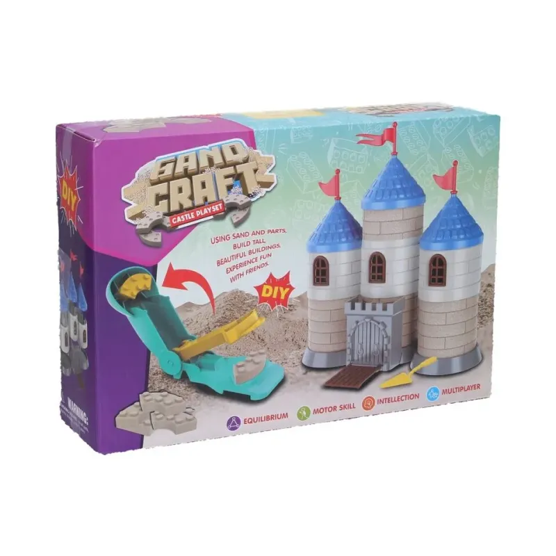 Obsah balenia: piesok, forma na tvorbu tehličiek, diely na stavbu hradu a ďalšie nástroje na prácu s pieskom.Obrázkový návod na zadnej strane obalu.Vhodné od 4+