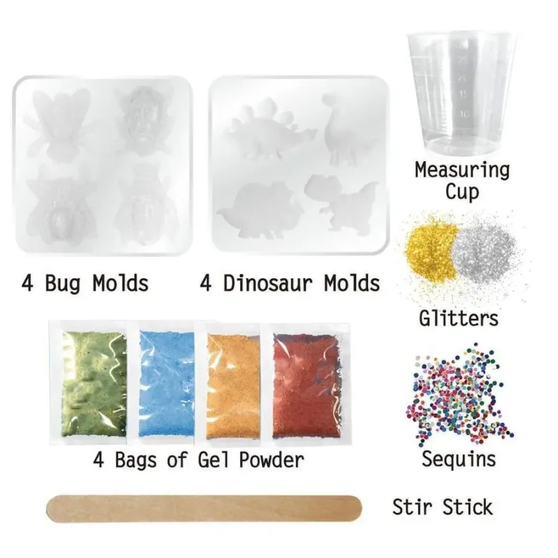 Balenie obsahuje: forma na odliatky - hmyzforma na odliatky - dinosaury4 vrecúška farebného práškového gélukonfetytrblietkyodmerný téglikmiešaca špachtľa