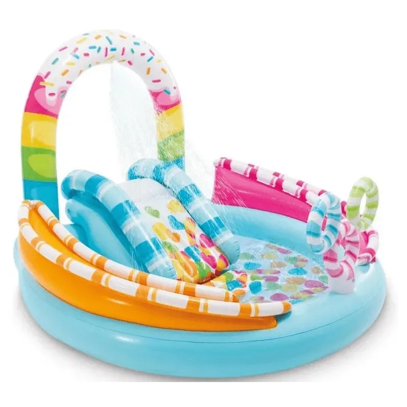 Hracie centrum Candy Fun - súprava obsahuje: sprchovacia brána (pripojiteľná na zdroj vody)nafukovacia šmykľavkadlhé koľajnice na loptičky po obvode bazénikahra hádzanie s loptičkouplastové loptičky (6 ks)sada na opravy, vypúšťací ventil