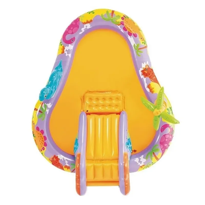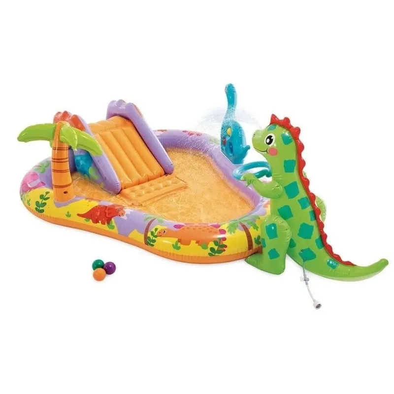 Toto nafukovacie hracie centrum ponúka bazénik so šmykľavkou, s nafukovacou palmou a nafukovacím dinosaurom s obručou na hádzenie balónikov.