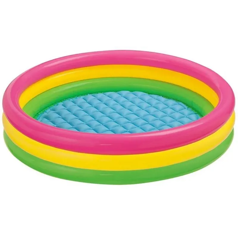 Nafukovací detský bazénik Intex sa skladá z troch kruhov vo farbách ružová, žltá a zelená.