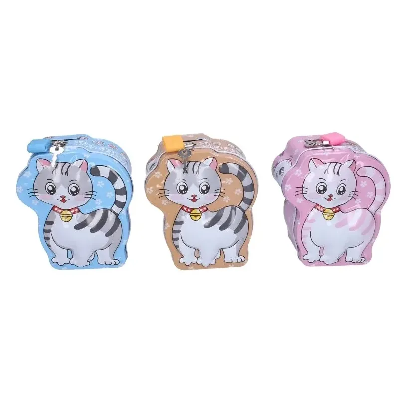 Plechová pokladnička s motívom mačky v rôzných farbách.
