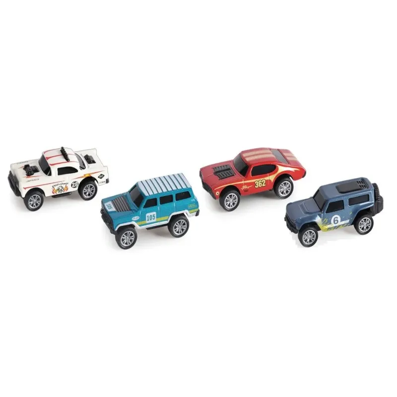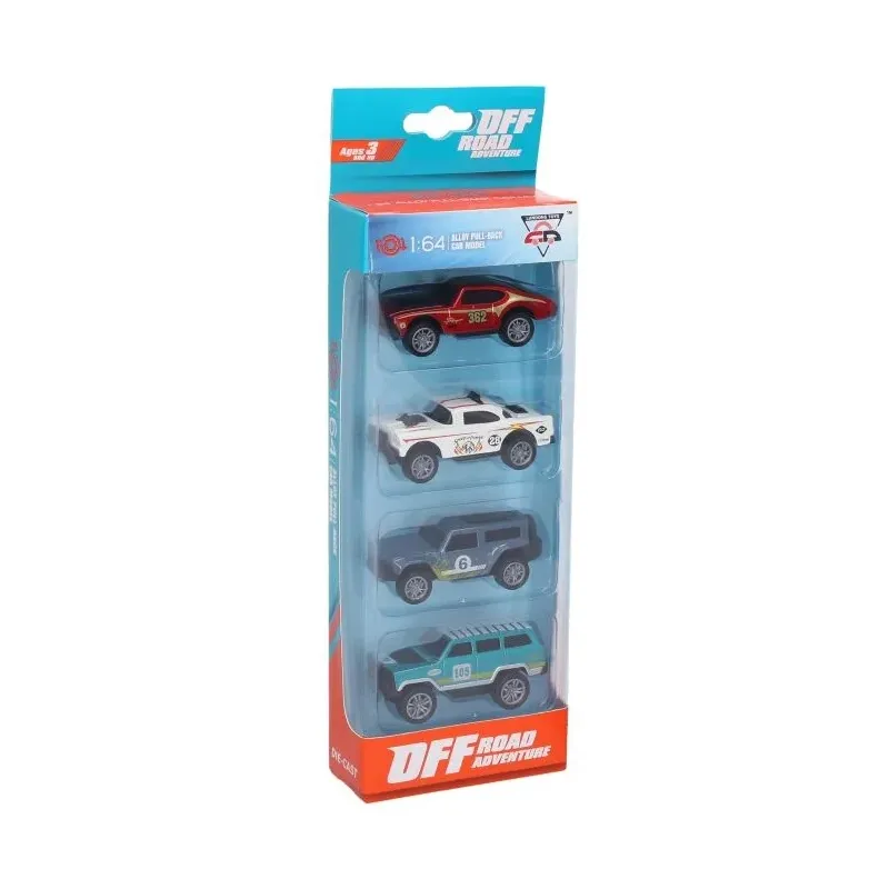 Štyri kovové autíčka na voľný pohon v jednom balení.