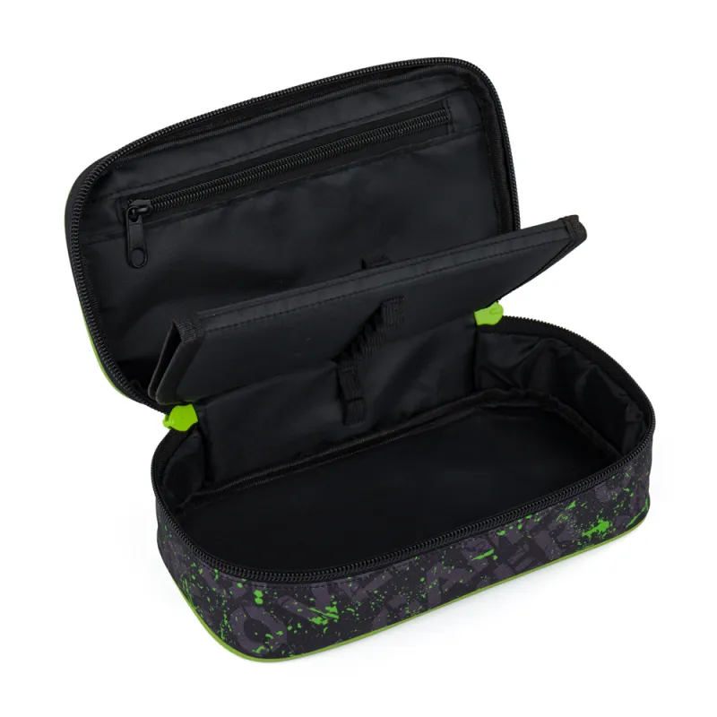 Školské puzdro je opatrené pevnými zipsami, uzatvárateľnou kapsičkou na zips, priehradkou na pravítko a klopou so šiestimi pútkami na písacie potreby. Pod klopou je miesto pre voľné uloženie písacích potrieb alebo iných drobností. Vhodné pre školákov na 2. stupni a starších študentov.