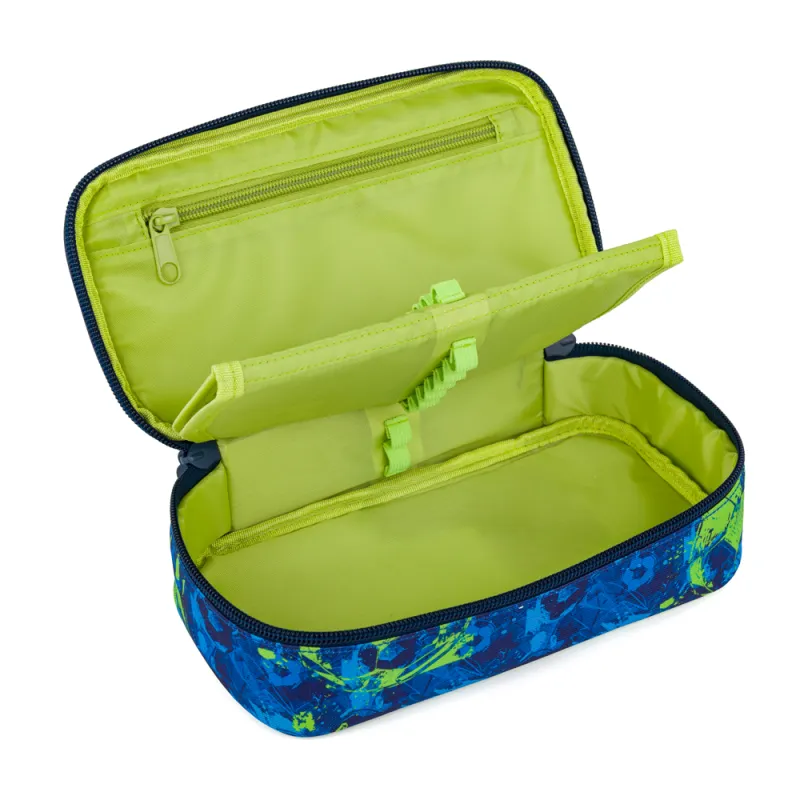 Školské puzdro je opatrené pevnými zipsami, uzatvárateľnou kapsičkou na zips, priehradkou na pravítko a klopou so šiestimi pútkami na písacie potreby. Pod klopou je miesto pre voľné uloženie písacích potrieb alebo iných drobností. Vhodné pre školákov na 2. stupni a starších študentov.