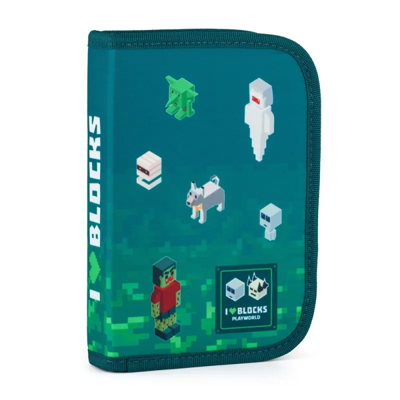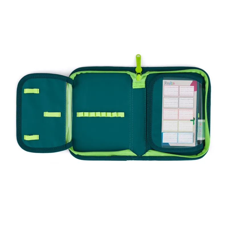 Jednoposchodový školský peračník s 2 chlopňami, prázdny obsahuje 25 gumových puzdier pre uchytenie písacích potrieb. Na vnútorných chlopniach sú priesvitné fólie pre rozvrh hodín.