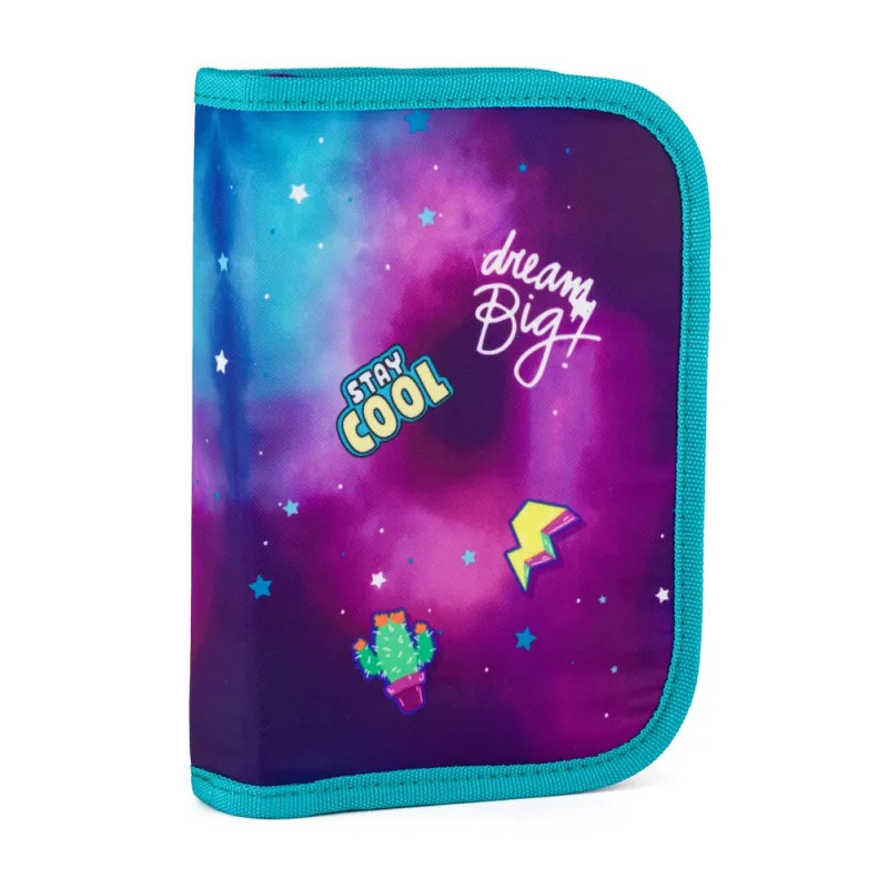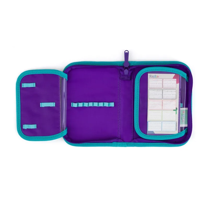 Jednoposchodový školský peračník s 2 klopami, prázdny obsahuje 25 gumových pútok pre uchytenie písacích potrieb. Na vnútorných klopách su priesvitné fólie pre rozvrh hodín.