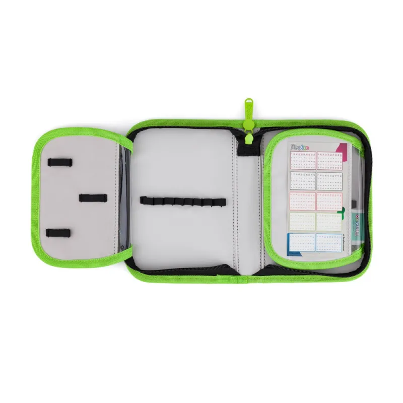 Jednoposchodový školský peračník s 2 chlopňami, prázdny obsahuje 25 gumových pútek pre uchytenie písacích potrieb. Na vnútorných chlopniach sú priehľadné fólie pre rozvrh hodín.