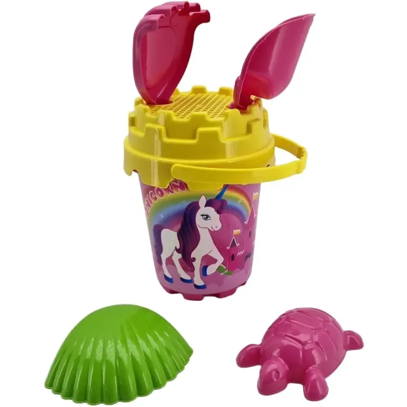 Táto sada do piesku obsahuje vedierko, sitko, hrable, lopatku a formičky.